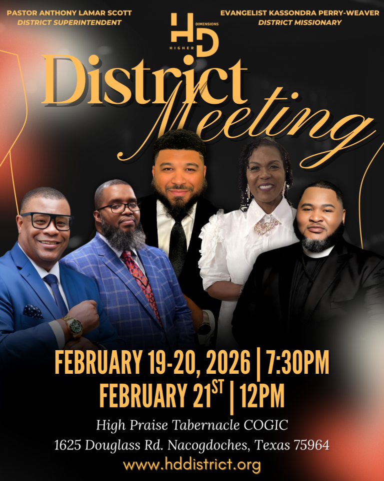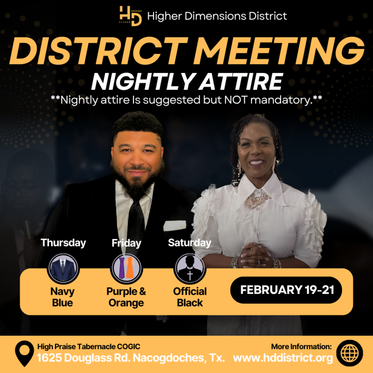 Higher Dimensions District is one of the most aggressive and progressive Districts in the Jurisdiction. Through the leading of the Lord and the counsel of our Leader, Bishop Prince E. W. Bryant, Sr. General Board Member, Higher Dimensions was Revamped and Revived. With a focus on equipping Pastors, Ministry Workers, and Parishioners with the tools to win souls for the Kingdom; we exist to build holistic ministries that minister to the needs of all mankind.